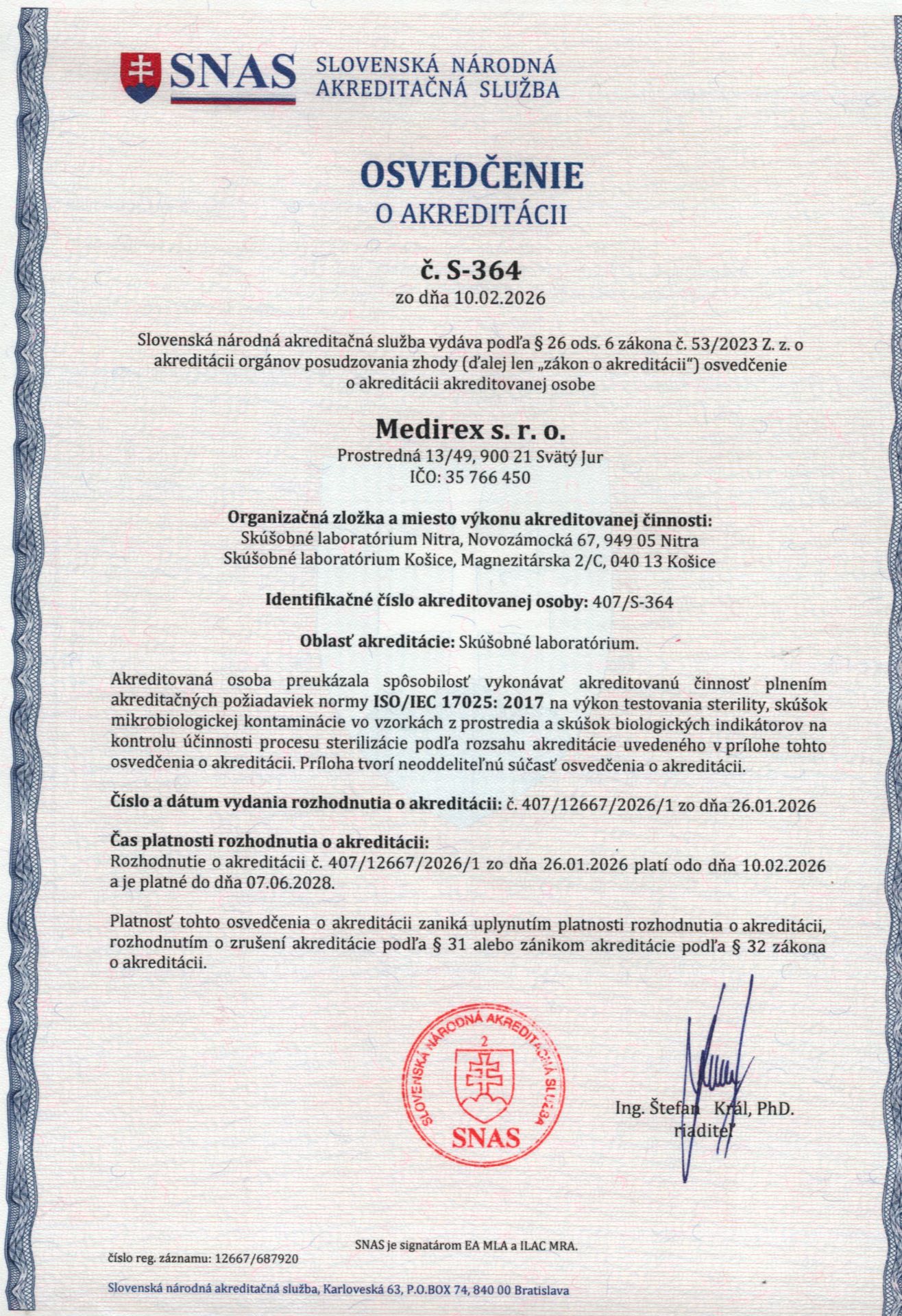 V roku 2023 bola akreditácia skúšobných laboratórií rozšírená o mikrobiologickú skúšku biologických indikátorov na kontrolu účinnosti procesu sterilizácie, ktorá je akreditovaná v skúšobnom laboratóriu Nitra, Novozámocká 67 a v skúšobnom laboratóriu Košice, Magnezitárska 2/C.
